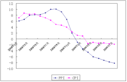 2009年上半年,居民消费价格同比下降1.1%,其中6月份同比下降1.7%,环比下降0.5%;工业品出厂价格同比下降5.9%,6月份同比下降7.8%。自今年2月份以来,CPI和PPI双双步入负区间运行,PPI降幅逐月下探,屡创新低,6月份CPI更创十年新低。6月份CPI、PPI数据均不太乐观,最主要的是环比也出现下降,市场普遍预期的“通胀”短期内难以出现,“通缩”风险并没有消除,而且有可能还在恶化。