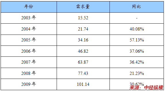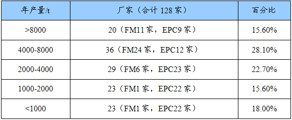 4、生产的技术正走向成熟,生产走向规模化,具体表现为:4000t/年以上较大规模企业数量从2003年的11.6%提高到2005年29.5%和2007年的43.7%;8000t/年以上规模化生产企业数量从2003年的只有3家,发展到2005年的12家,到2007年提高到20家,1万t/年以上的企业数量增长到11家。