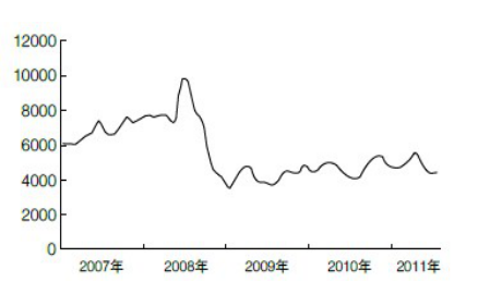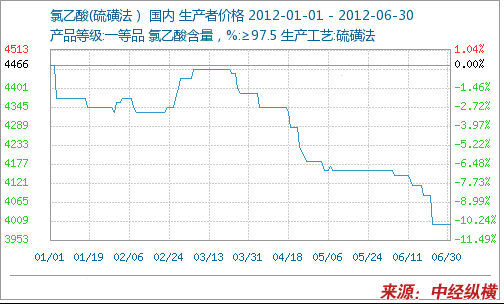 由图上可以看出,2012上半年氯乙酸行情主呈下滑趋势,一月初价格4466元/吨(含税),六月末价格4000元/吨(含税),跌幅达10.45%。