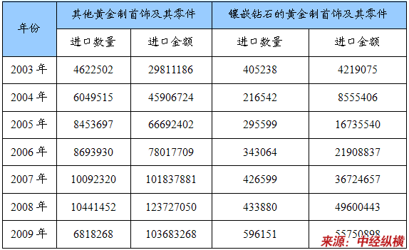 2003-2009年我国黄金饰品进口数量及金额统计表