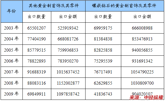 2003-2009年我国黄金饰品出口数量及金额统计表