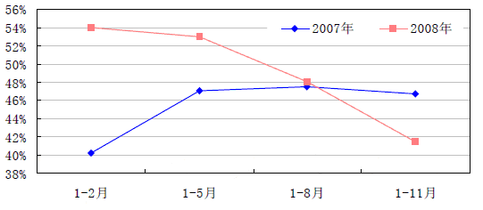 2008年1-11月我国工程机械 行业 累计产品销售收入同比增长
