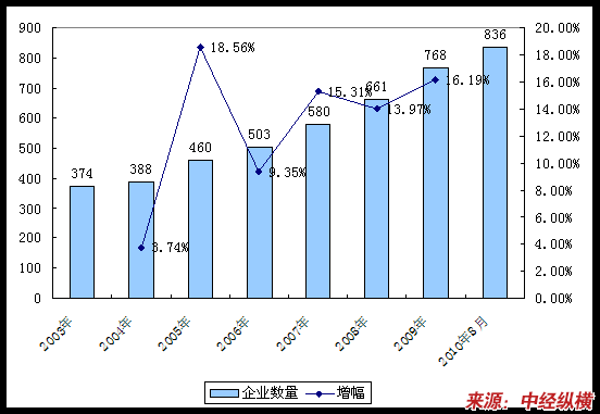 2003-2010年1-8月生物、生化制品制造 行业 企业数量发展状况