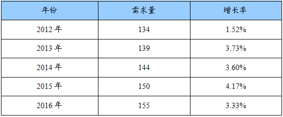 2012-2016年化学品氧化铝需求量增长预测