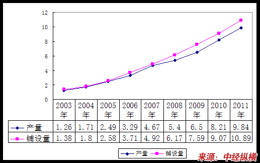 2003-2011年中国燃气用PE管产量、铺设量对比