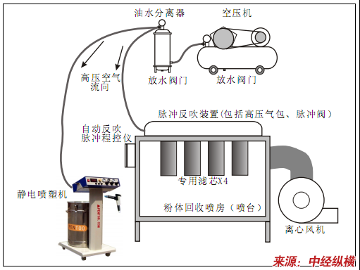 使用设备:静电喷涂机、粉体回收喷房、空压机、油水分离机