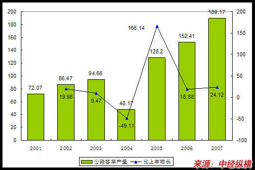 2001-2007年我国公路客车产量和增速度变化趋势