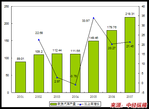 2001年2001-2007年我国载货汽车产量和增速度变化趋势