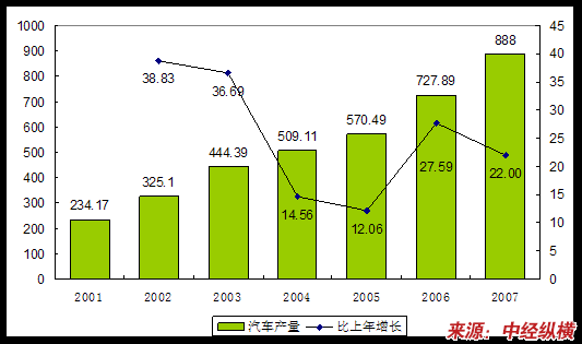 2001-2007年我国汽车产量和增速度变化趋势