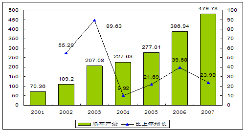 2001-2007年我国轿车产量和增速度变化趋势