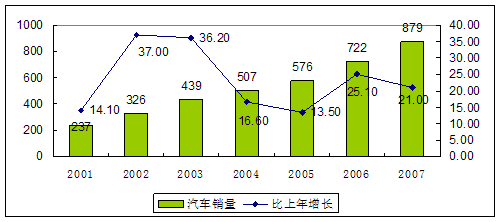 2001-2007年汽车销量及增长速度变化趋势