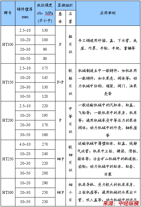 灰铸铁主要用于制造承受压力和振动的零部件,如制动器、机床床身、各种箱体、壳体、泵体、缸体等。灰铸铁的牌号、力学性能、显微组织及用途示于下表。
