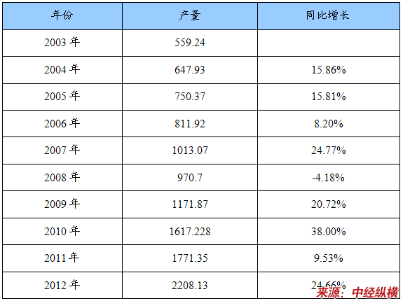 植绒地毯上游主要原材料合成纤维产量增长统计表