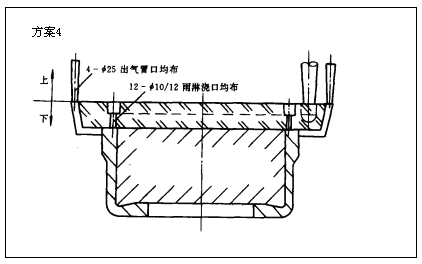 浇注系统方案4 —采用型芯形成顶注式雨淋浇口,使工艺简化,效率提高, 质量保证。