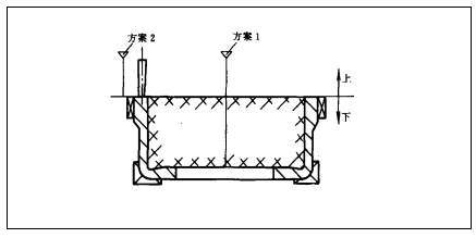 浇注系统方案3 —采用专用砂箱形成顶注式雨淋浇口。造成良好的顺序凝固, 以解决上述铸造缺陷。铸件经磁粉探伤及射线照相检查,一次性合格。