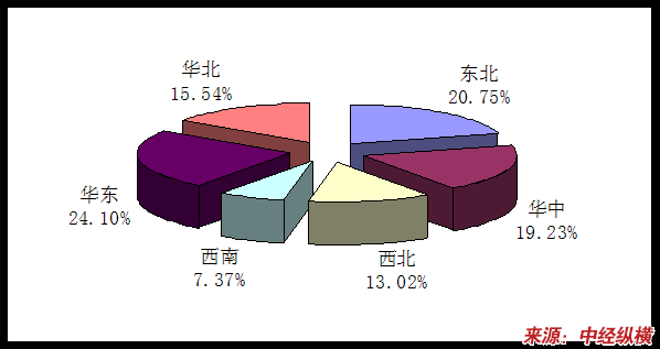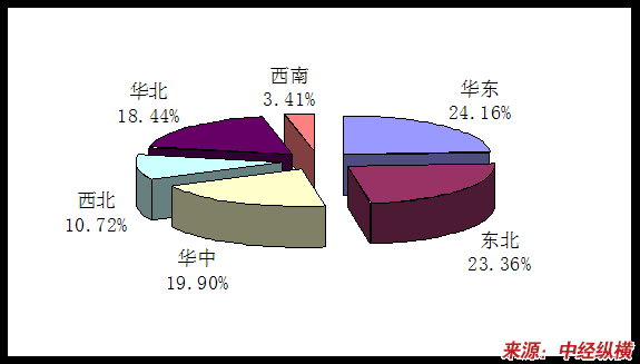 以上是对重型载货汽车中/后桥制动鼓是市场分布的 分析 (根据需求计算而得),图中反应,东北市场从2007年到2009年6月的波动较大,是一个市场份额减少到恢复的过程,华中保持稳定,华东从市场份额增加到基本恢复07年市场份额,其他地区相对稳定。