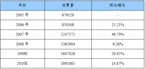2005—2010年重型载货汽车(含底盘)中/后桥制动鼓消费量 分析 及预测表