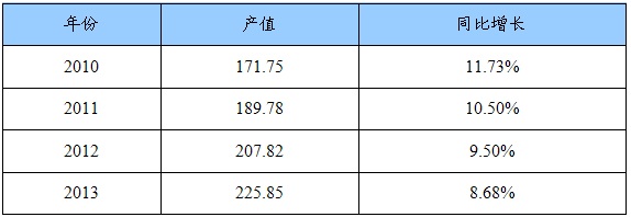 2010-2013年我国职业装产值预测表