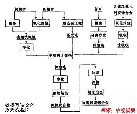 铼的提取方法需要根据含铼原料及铼产品来确定。提取铼时先从含铼原料中制取含铼溶液,溶液经分离净化提取纯铼化合物,然后用氢还原法、水溶液电解法、卤化物热离解法制取铼粉,再用粉末冶金的方法加工成材。铼的提取冶金过程主要包括含铼原料制取、铼钼分离、铼中间化合物制取、粗铼粉制取和铼的精炼致密化等步骤。