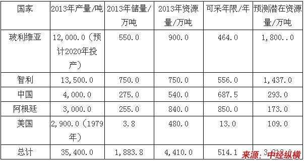 正如专家们指出的,阿根廷、玻利维亚、智利和中国拥有世界上70%的卤水型锂资源。锂资源高度集中的分布特点使得锂资源的生产容易受到国家政策和市场垄断行为的影响。即使玻利维亚拥有数量巨大的锂资源,但是还有很多问题限制着锂资源的开采与利用,包括政治和环境问题、运输问题以及淡水资源匮乏的问题,而淡水资源是锂溶解过程中所必须的。
