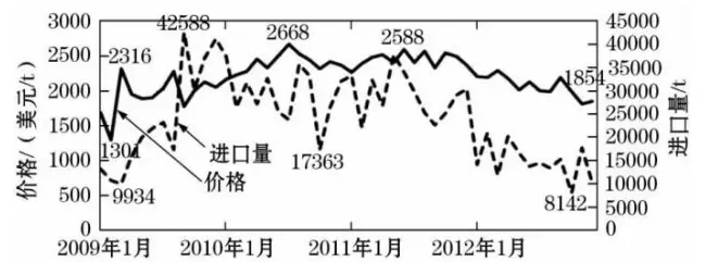 2009-2012年钴湿法冶炼中间品进口量与价格
