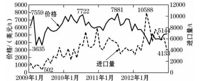 随着经济的快速发展,中国对钴资源的需求量在逐渐增加,进口量保持相对稳定。这不仅是因为中国国内钴产品的大量生产,缓解了中国进口钴产品的压力;还因为中国坚持国外进口与国内生产并行的道路,极好地降低了他国对钴价格垄断的风险。同时,部分钴产品的进口量与价格的反比例关系显现了中国良好的进口策略。即每当价格升高时进口额降低,当价格降低时进口额猛增,在图中显示出上下呼应的三角形的形状。这样的进口策略极好地平抑了价格,降低了对中国进口的不利影响。