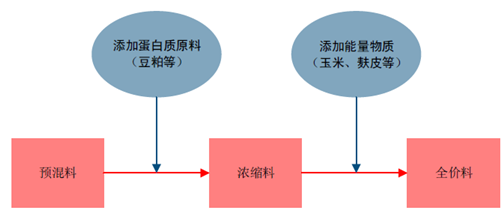 配合饲料是未来的发展方向。按照饲料的营养成分来分,配合饲料可以分为预混料(混合饲料)、浓缩料、全价料。预混料是由同一类的多种添加剂或不同类的多种添加剂按一定配比制作而成的匀质混和物,是饲料中的核心部分,也是初级加工饲料;浓缩料是由蛋白原料和预混料组成,是预混料的深加工产品;全价料是指在动物的不同生长阶段、不同生理要求、不同生产用途的营养需要,在浓缩料的基础上添加玉米等能量物质,是目前饲料加工的最高形式。从饲料的营养成分及使用方式来看,配合饲料能够提供动物发育所需的全部营养物质,是未来饲料加工的主要方向。