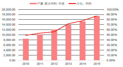 我国配合饲料发展势头良好,占比不断提高。2010年至今,配合饲料产量不断提高,年复合增长率为12.71%;配合饲料占比也处于不断提升的过程,从2010年的48.65%提升到2015年的86.94%。配合饲料能够直接用于喂养动物,是饲料产品主要发展的方向,也是大型养殖企业首选饲料,我们预计配合饲料的占比会继续提高。