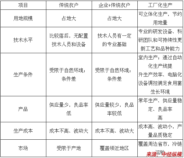 为解决传统农户种植的技术瓶颈,企业+农户的生产模式逐渐被推广,由企业提供专业的技术人员向农户传授配方定制、培育技术等知识,农户则为企业提供其所需的食用菌产品。该生产模式一方面解决了传统农户种植模式下技术水平不高的缺陷,另一方面为企业节省了用地、厂房建设等大额成本投入。然而,自然条件等外在因素仍无法有效解决,且种植规模受制于农户用地,导致产量未能取得突破性增长。