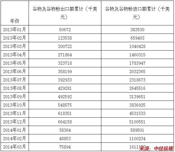 2013年01月-2014年03月中国谷物及谷物粉进出口额累计