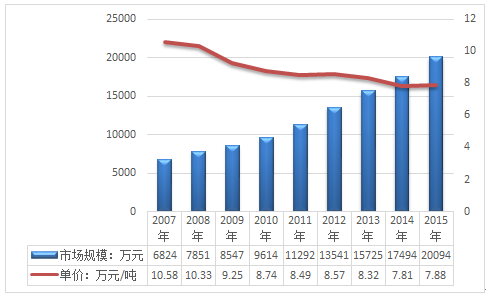 2007-2015年我国纳豆市场规模及产品均价走势图
