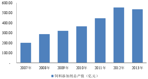 2007年至2013年,我国饲料添加剂(主要为生物饲料产品)的产值规模增长情况如下: