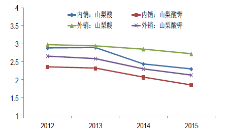 2012-2015年中国山梨酸(钾)价格走势图
