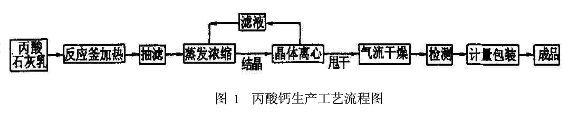 文献提出了一种由丙酸与碳酸钙或氢氧化钙进行中和反应的600t/a生产能力的工艺。丙酸同碳酸钙的反应同丙酸与碳酸钠的反应完全相似。丙酸同氢氧化钙的反应及其生产工艺见图1。