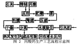 该工艺的主要工序是反应、过滤和干燥。经过筛选后的石灰用清水清洗,过滤后沉淀,并放置两天以上进行老化,做成石灰乳备用。在反应釜内加入1.8m³预加水,并启动搅拌器,加入石灰乳500kg,开蒸汽升温至55~55℃后恒温,缓慢往反应釜内加入丙酸,直到pH值=6.8~7.0为止,然后再往釜内加入蒸汽继续升温至95~100℃,并熟化20min。反应釜出来的粗料液,经过两级过滤后得到精料液送去干燥,在喷雾干燥塔中与加热过的高温空气并流接触,使料液中的水分汽化。干燥后的产品经旋风分离收集包装,尾气中的尘埃再经过水膜除尘器净化后送反应回收使用。