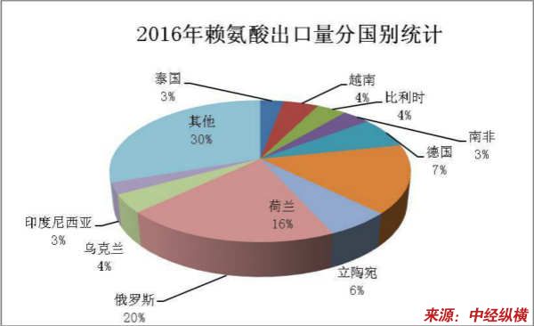 2017年1-5月我国赖氨酸的出口国家主要有俄罗斯(28827.78t)、荷兰(22302.00t)、越南(10841.18t)、德国(9859.62t)、立陶宛(7013.03t)、泰国(6303.97t)、印度尼西亚(5488.00t)等。其中我国除了对越南、泰国和印度尼西亚的出口比例与2016年同期相比上涨外,对其他主要国家的赖氨酸出口量均有不同程度的下降。据海关统计数据显示,一季度期间我国出口至各大洲赖氨酸数量同比相对平稳,出口至欧洲地区比例偏低,仅占总出口量的55%-58%之间;低于2016年同期水平;2017年4、5月期间我国出口赖氨酸数量有较为明显的变化,其中出口至欧洲地区数量占总出口量比例有所降低,仅占总出口量的52%,低于2016年同期3个百分点。由于2016年以来亚洲地区饲料业高速发展,对赖氨酸需求量也随之增多,这继续成为我国赖氨酸出口量的一大重要增长点。