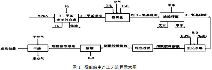 该生产流程采用连续生产方式,但各主要工序之间具有一定的独立性,可在一定的时间内独立运行,因而使生产具有较大的灵活性。如生产可以从2-甲基-1,5戊二胺合成3-甲基吡啶开始,也可以直接以3-甲基吡啶为原料进行氨氧化反应开始。