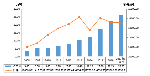 2017年11月进口婴幼儿配方奶粉3.44万吨,同比增46.35%,环比增25.88%;进口额4.35亿元,同比增35.72%,环比增13.65%。2017年1-11月累计进口婴幼儿配方奶粉26.35万吨,同比增35.28%,为2016年全年进口量的1.2倍;累计进口额35.65亿元,同比增34.09%。2017年1-11月婴幼儿配方奶粉平均价格(到岸价,不含关税、增值税等费用)为13532.2美元/吨,折合人民币80.62元/900g。