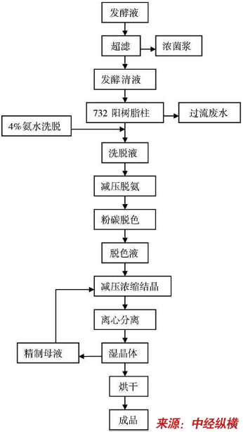发酵液经超滤除去菌体以及大分子蛋白,接着调节一定的pH和流速通过732型强酸性阳离子交换树脂(H+型),L-丙氨酸被交换到树脂上,发酵清液中的大部分色素、可溶性蛋白、阴离子则随过流废水排走,随后用4%的氨水将树脂上的L-丙氨酸完全洗脱下来,通过减压驱氨、活性炭脱色、浓缩结晶、离心、干燥等步骤获得L-丙氨酸成品。离心分离的精制母液循环回用,可有效提高提取的收率。