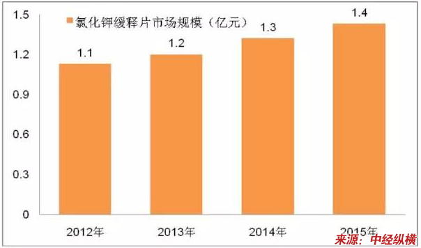 近年来,我国氯化钾缓释片市场保持稳定增长态势。2015年,我国氯化钾缓释片市场规模为1.4亿元。
