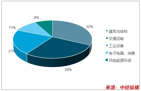 截至2016年底,中国玻纤总产能为380万吨,中国巨石、中材科技(泰山玻纤)是国内玻纤 行业 龙头,分列第一、第二位,中国巨石占比32%,泰山玻纤占比16%,整合之后玻纤产能合计占比接近50%。2017年以来,玻纤价格总体保持相对平稳,全国玻纤均价维持在4700元/吨左右。玻纤作为高性能复合材料的原材料,下游应用广泛,目前玻纤材料主要应用在建筑、交通以及工业设备等领域,在建筑与结构领域分布占比最高,大约为32%。其次,在交通运输领域占比约为28%。