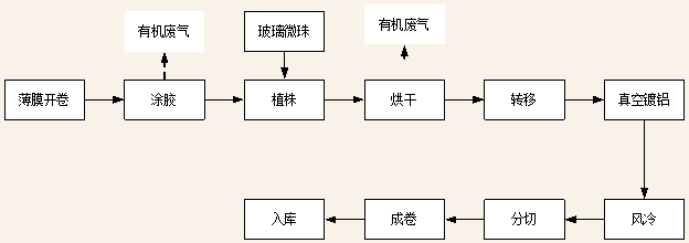 先在涂布机上将PET薄膜表面涂上已经配制好的着色树脂,再涂上植株胶以备植珠,等植珠结束在其表面投上聚焦树脂再进行真空镀铝,再将涂好胶的防粘纸与已镀铝的PET薄膜进行复合,接着剥离PET膜利用分切设备按照要求进行分切处理,最后包装入库。