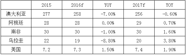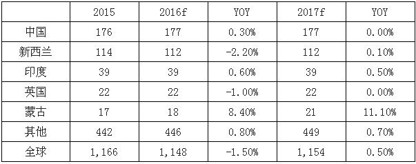 世界上主要羊毛生产国包括澳大利亚、中国和新西兰, 2015 年羊毛产量分别占世界总量的 23.76%、15.09%和 9.78%,三国产量合计占比 世界总产量的一半。澳大利亚和新西兰羊毛产量预计 2016-2017 年均呈现下降的趋 势,而中国羊毛产量相对稳定。其他农业企业的竞争是羊毛产量下降的主要因素, 各个羊毛生产国的主要竞争企业有所不同。比如,澳大利主要受到种植业、羊肉生 产对绵羊数量的影响以及季节的影响。新西兰则受到乳制品企业对土地的占用的影 响。澳大利亚羊毛品质较为细长,主要用于服饰生产,中国羊毛和新西兰羊毛品质 较为粗短,主要用于室内纺织品生产。据统计,2014 年澳大利亚毛占 世界羊毛服装市场的 46%,中国羊毛占比 12%,所以澳毛价格变动能够较好的反映 用于服饰生产的羊毛的供需情况。