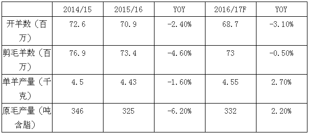 澳大利亚绵羊数量以及原毛产量逐年减少。澳大利亚绵羊数量从 2000/01 年度 1.2 亿头锐减到 2016/17(预测)的 7000 万头左右。澳大利亚原毛产量从 2000/01 年度 的约 60 万吨下降到 2015/16 年度 32.2 万吨,是自 1923/24 年度以来的最低产量水平。 根据 AWI 预测委员会对澳大利亚羊毛产量的预测,2016/17 年度羊存栏数和剪毛羊 数分别较去年下降 3.1%和 0.5%。但是在过去的一年中(2015 年 12 月至 2016 年 11 月),由于大部分绵羊养殖区雨水充沛,单只羊的产量将从 2015/16 年度的 4.43kg 预计上升至 4.55kg。