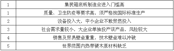 底板占集装箱总成本的 15%,木质地板原来依赖进口。集装箱底板是集 装箱承重的主要功能部位,系集装箱的重要组成部分和主要承载配件, 故质量要求极高,不仅具有极高的强度、刚度、耐磨性、抗腐蚀性等物 理性能,而且具有自重轻、易维修等经济性能优点。底板占集装箱总成 本的 15%左右,在集装箱需求放缓、钢材和人工等成本难以控制的情况 下,低成本高质量的底板更受箱东的欢迎。目前,国内集装箱底板主要采用进口热带硬阔叶木材克隆木、阿必东等,辅助采用进口尤加利、桉 木以及其他硬杂。我国森林资源紧缺的矛盾十分突出:森林覆盖率只有 全球平均水平的 2/3,排在世界第 139 位;人均森林面积 0.145 公顷, 不足世界人均占有量的 1/4。由于各国对保护天然林工作日益重视,特 别是对珍稀树种保护工作的加强,使得进口传统集装箱底板原料和以其 作为原料的集装箱底板的质量、数量及价格均受到影响,加剧了 行业 成 本问题。