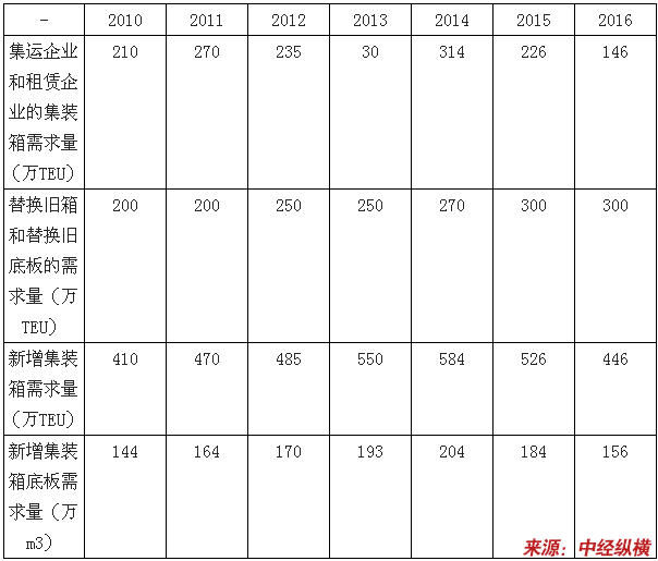 集装箱底板需求分为来自新建集装箱的新增需求和替换旧集装箱的需求。集装箱的寿命在 15 年左右,集装箱底板的寿命在 8 年左右,截至 2015 年底全球集装箱 保有量约为 3800 万 TEU,由此测算每年替换旧箱和旧板的需求量约为 300万TEU;2015年和2016年全球集装箱需求分别回落至226万TEU 和 146 万 TEU,按每 TEU 集装箱需要 0.35m3底板估算 2015、2016 集 装箱底板需求量分别为 184 万 m 3和 156 万 m 3,市场规模在百亿左右。 在全球集装箱需求放缓的情况下,替换旧箱和旧板的需求支撑了集装箱 底板的需求量,未来随着新增需求的回暖,底板 行业 有望实现复苏。