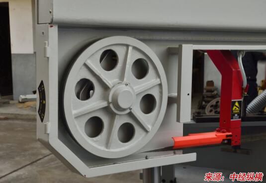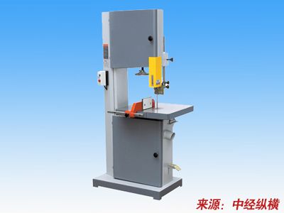 更换锯条时先打开上下护门,松开滑板固定螺钉,转动升降手轮,使上锯轮下降,锯条松动,取出旧锯条,将磨修好的锯条套在上下锯轮上,注意将锯齿的锐角方向向下,不要上翻,然后再转动升降手轮,使上锯轮上升,张紧锯条。再用手转动上锯轮,看锯齿是否全部露在锯轮轮缘的外侧面,如未露出即应再将上锯轮加以调整,直到锯齿露出轮缘,在上下锯轮边缘走动平稳,并垂直于工作台面为止。