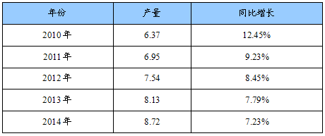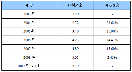 工业用材尽管也将表现出良好的趋势,但在强度上不会像2008年以前那样遥遥领涨于建筑钢材,而是将围绕建筑钢材做趋势性运行。我们预计,由于全球消费存在一定的不确定性,中国消费也需要政府进一步出台政策来强化刺激,因此,工业生产强度存在调整的可能,整体表现为平缓增长的态势,由此对工业用钢材的需求强度不及建筑钢材的需求强度。另外,随着工业用材产能的持续增长,产量增大,也将对工业材的市场走势产生压制。