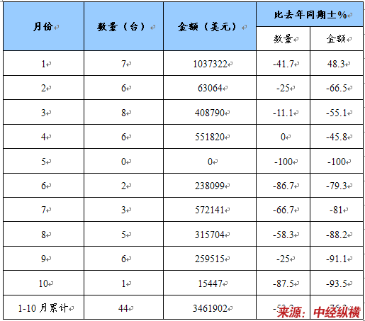 2011年1-10月,按进口数量排名前三的国家是日本(13台,421781美元)、以色列(8台,1531356美元)、美国(7台,106394美元),前三位国家占整个进口数量的47.73%。