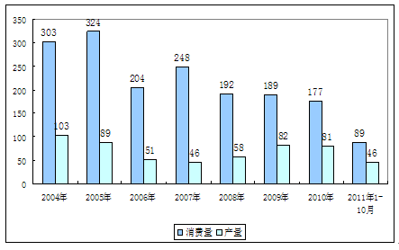 2004-2011年10月中国激光照排机产量、消费量对比图 单位:台